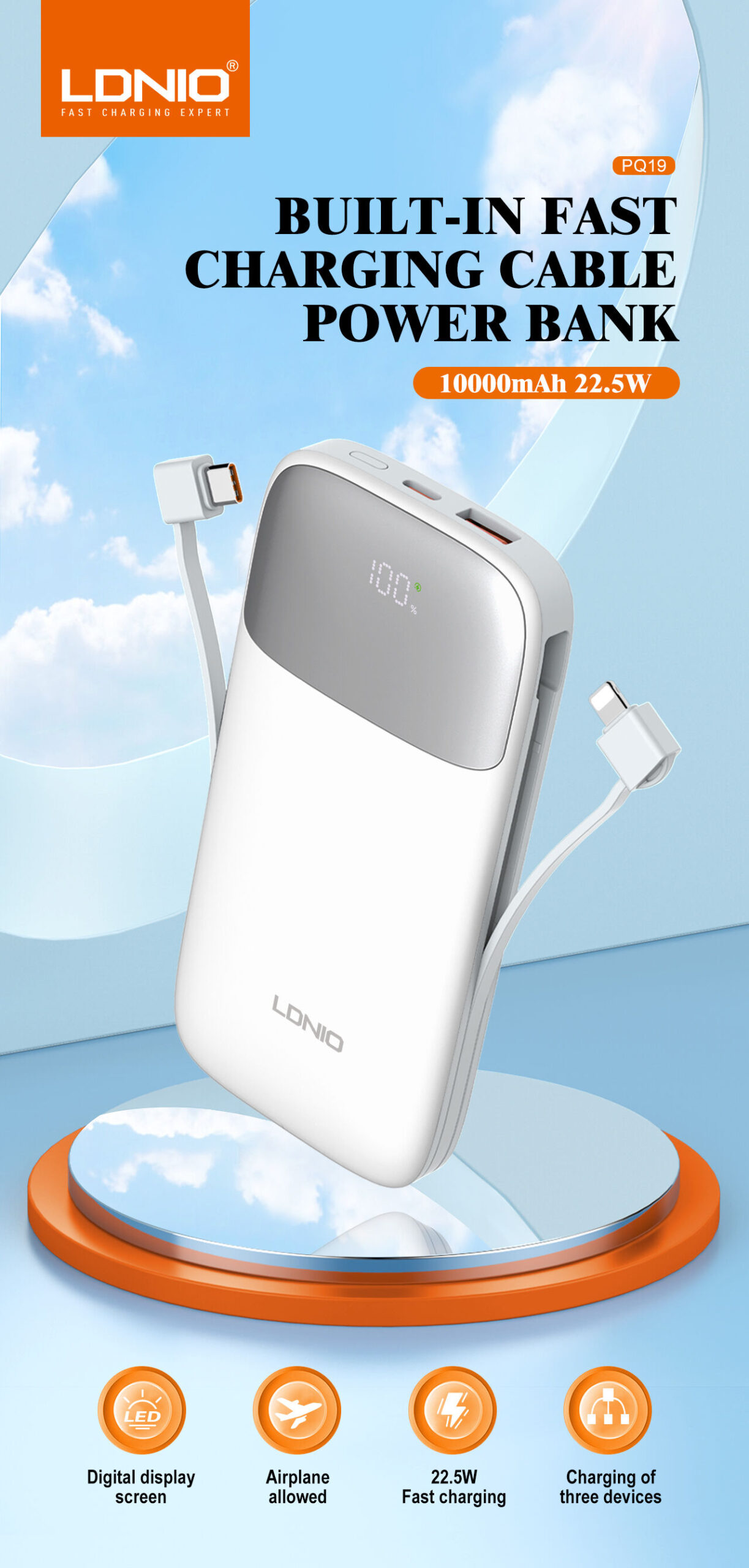 LDNIO PQ19 10000mAh 22.5W USB-C Fast Charging Power Banks smart LED Display Built-in Charging Cable Power Bank